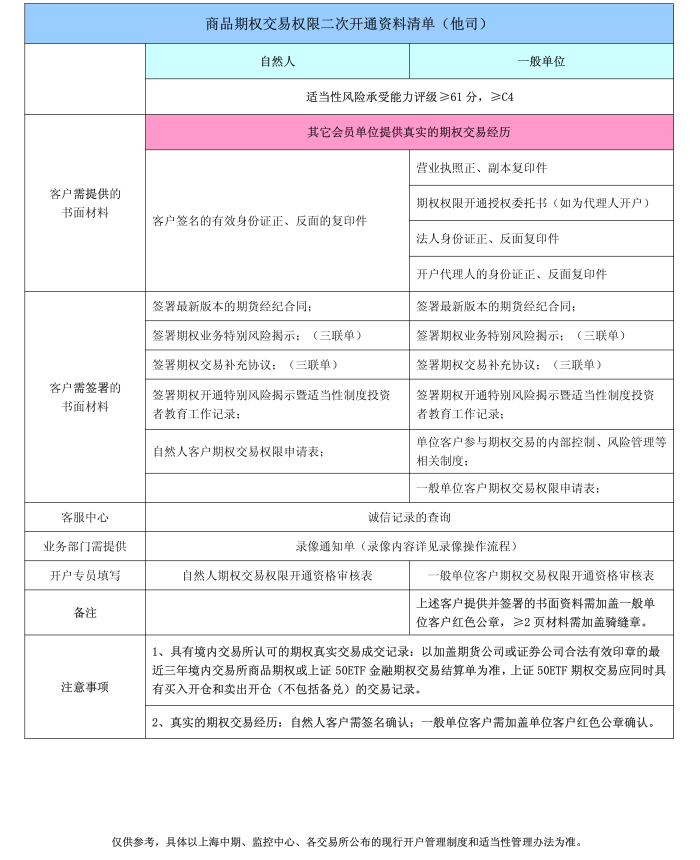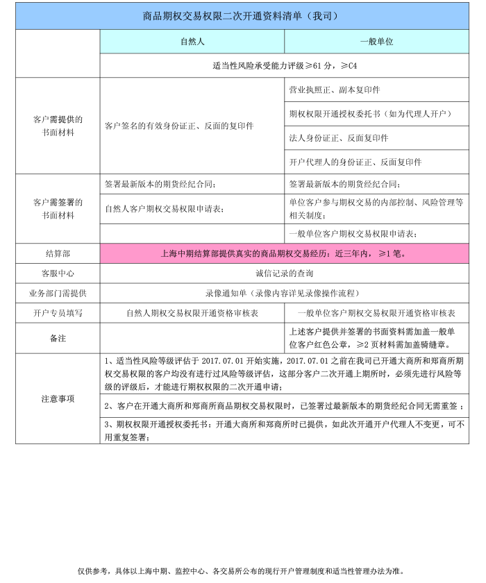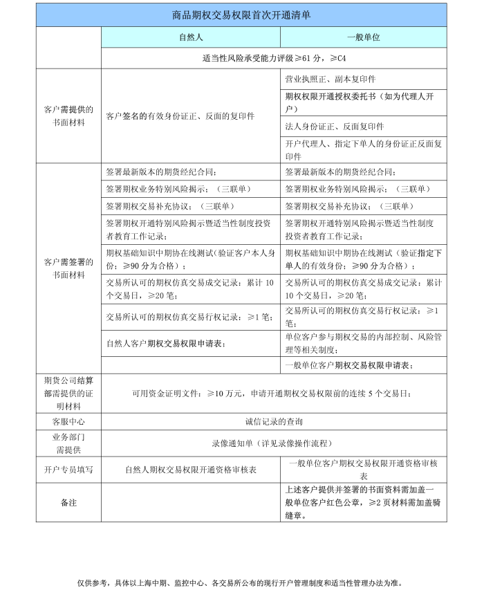 商品期權(quán)交易權(quán)限開通清單(首次、二次)
